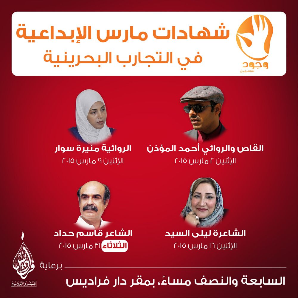 تستمر "وجود للثقافة والإبداع" وبالتعاون مع "دار فراديس للنشر والتوزيع تقديم موسمها الثقافي "شهادات إبداعية في التجارب البحرينية" حيث يتم استضافة عدد من الكتّاب والمبدعين في شتى المجالات و من مختلف التخصصات للادلاء بشهاداتهم حول تجربتهم الإبداعية، وفتح باب النقاش حولها بمشاركة الجمهور.