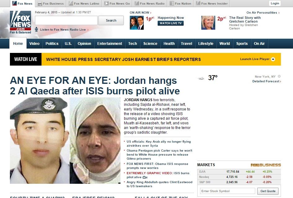 اختارت قناة "فوكس نيوز"، بخلاف بقية وسائل الاعلام الاميركية، ان تعرض ثم ان تبث على موقعها الالكتروني شريط قتل الطيار الاردني معاذ الكساسبة حرقا بأيدي جهاديي تنظيم داعش.