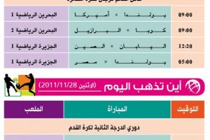 يضع الوسط الرياضي أمامكم برنامج اليوم الرياضي الكامل لقناة البحرين الرياضية لليوم الاثنين الموافق 28/11. مشاهدة ممتعة نتمناها لكم أعزائي القراء.