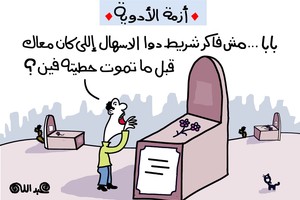نشرت صحيفة "المصري اليوم" كاريكاتيراً بشأن أزمة الأدوية في مصر، إذ صوّر الفنان شخصاً يذهب إلى قبر أبيه مخاطباً إياه "بابا.. مش فاكر شريط دوا الإسهال اللي كان معاك قبل تموت حطيته ...